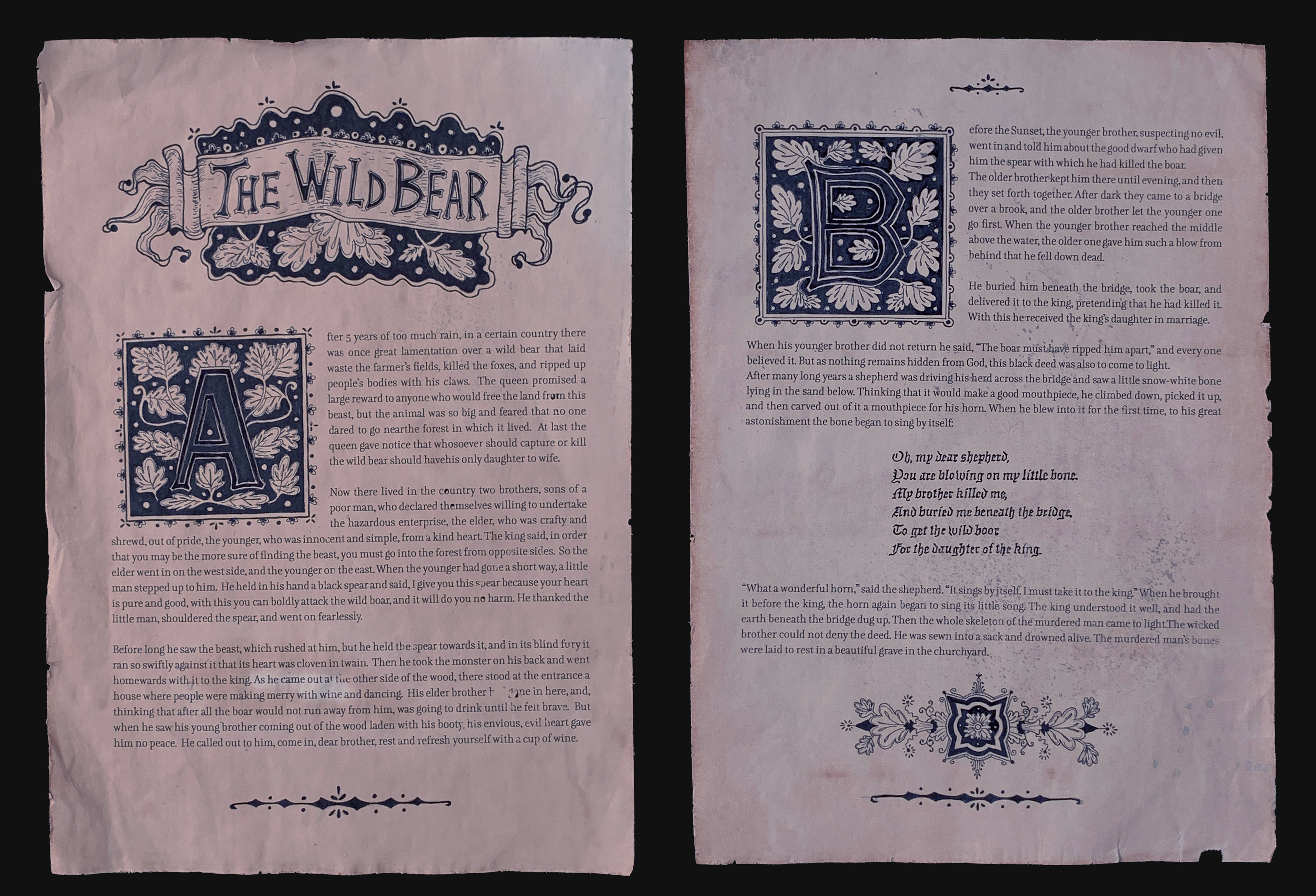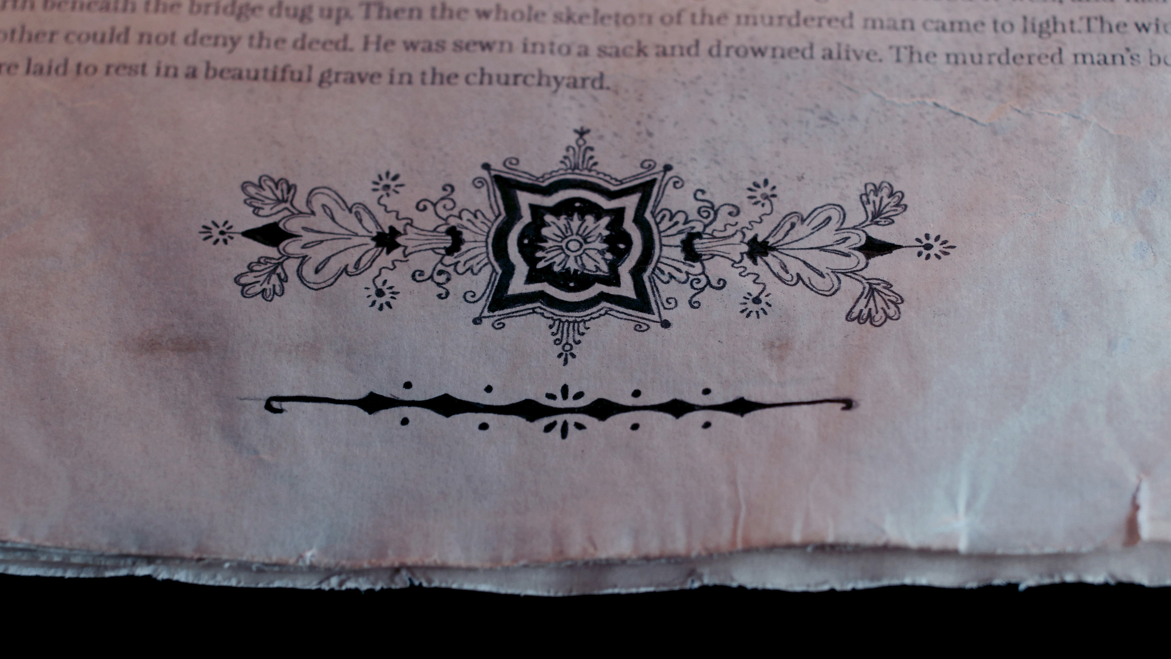 Techniques: ink illustration, paper ageing, calligraphy, texturing